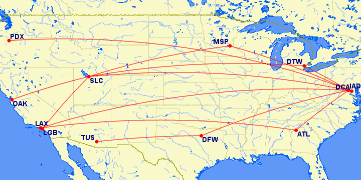 | DCA (38°51’07″N 77°02’16″W) | SLC (40°47’18″N 111°58’40″W) | 285.4° | |