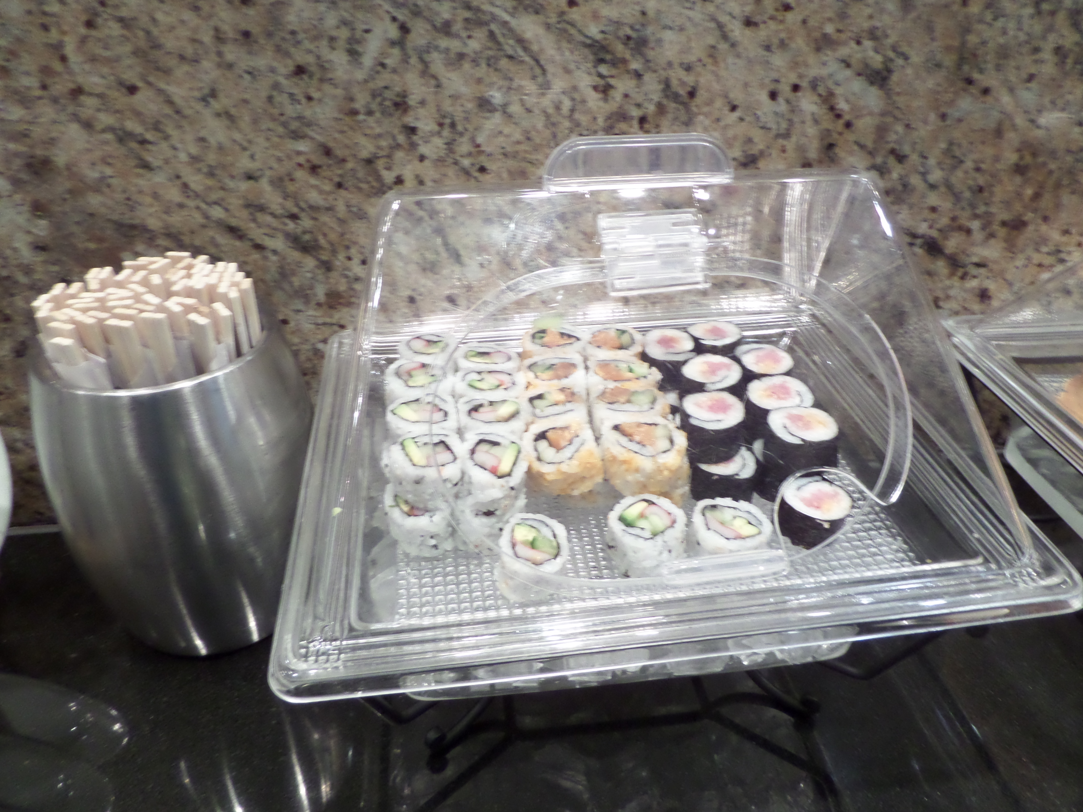 The Lounge had an open bar and fridge stocked with bottled water and soda. There was a decent continental breakfast spread and a small selection of commodity Sushi. Now to be fair I think during lunch and dinner there may be other food selections available, but considering a flashly title like flagship lounge, I would have hoped for something more. When comparing this lounge to what Delta and United offer, this lounge is right there in the pack. The bar is currently set low for US airlines and airport Lounges. This lounge is also relatively small and fairly crowded as there were several flights to asia leaving around the same time.
