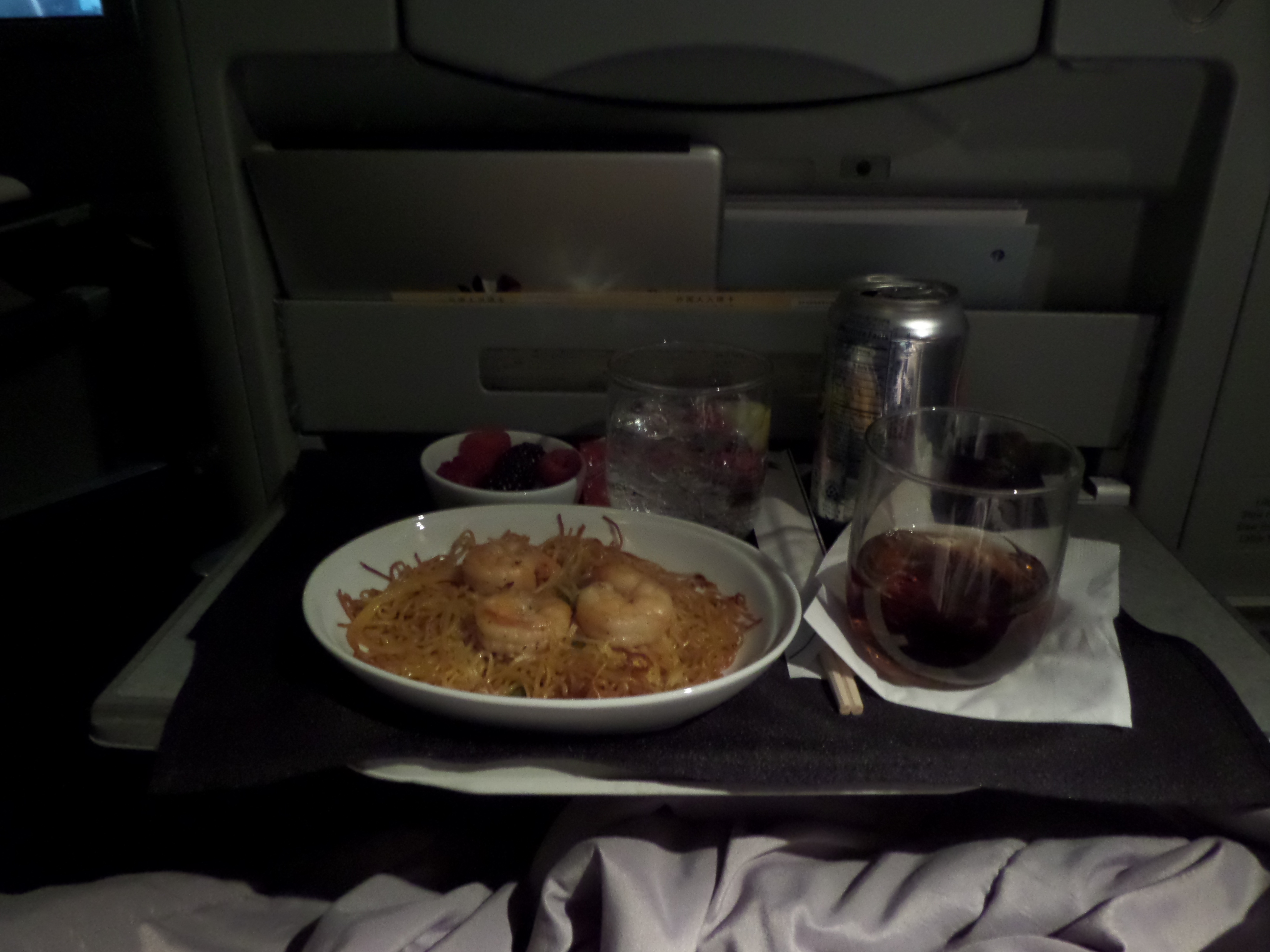 About two thirds way through the flight a snack was served. I ordered the fried noodles with Shrimp, which were “not” good, as the noodles were dry/overcooked. The other option (Croissant Sandwich) didn’t look that much better though.