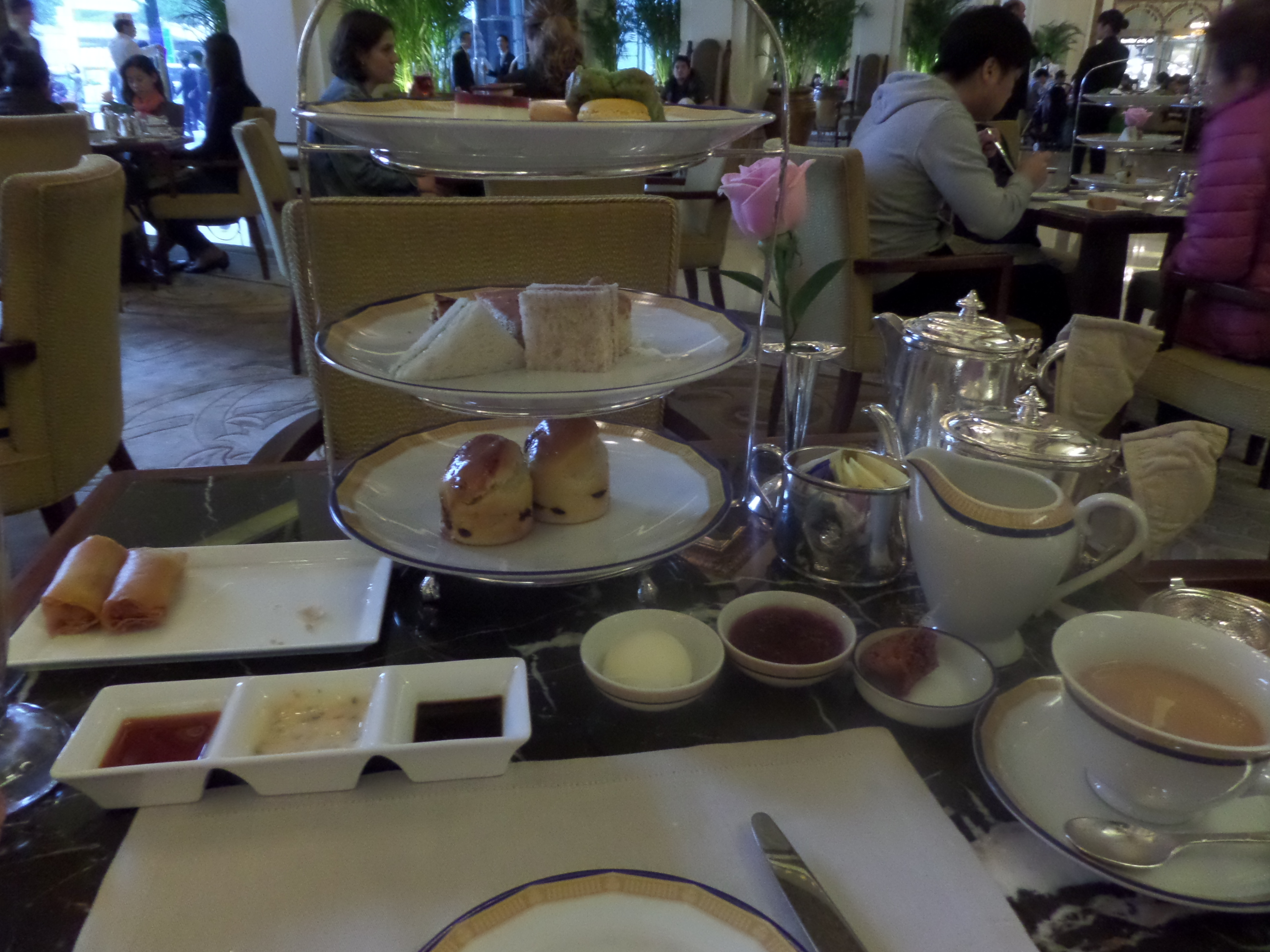 SAMSUNG CAMERA PICTURESAs for the tower of treats, this was an extremely complete sampling of finger sandwiches, petit fours, and scones with jam and clotted cream. Everything was delicious although to be completely honest the scones were not the type I was expecting.  The pennisula serves scones that are more like brioche than the dry crustier variety I am used to.  Despite the high cost (Expect over $40 USD per person) I thoroughly enjoyed my expensive afternoon snack.  The staff will also kindly wrap up any leftovers in a very nice to-go bag which will advertise your good taste.